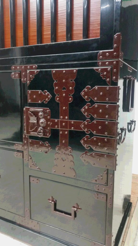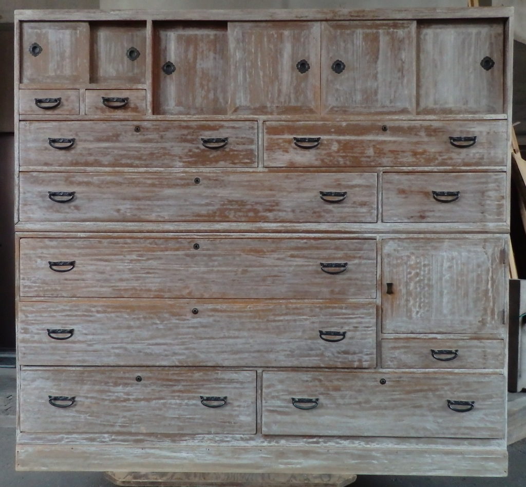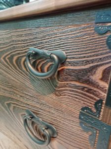 丁寧に仕上げられた、白木のままの生地箪笥は、塗りを施されますが、蝋を塗り込んだ白木仕上げに、拭き漆仕上げ、黒漆塗りを施したものがありました…。特にその後に蒔絵を入れた豪華な仕上げの箪笥もありました…。桐箪笥(杉と松と桐を併用)にはヤシャブシと砥粉を塗った後に天然蝋の本イボタ蝋で仕上げていました。