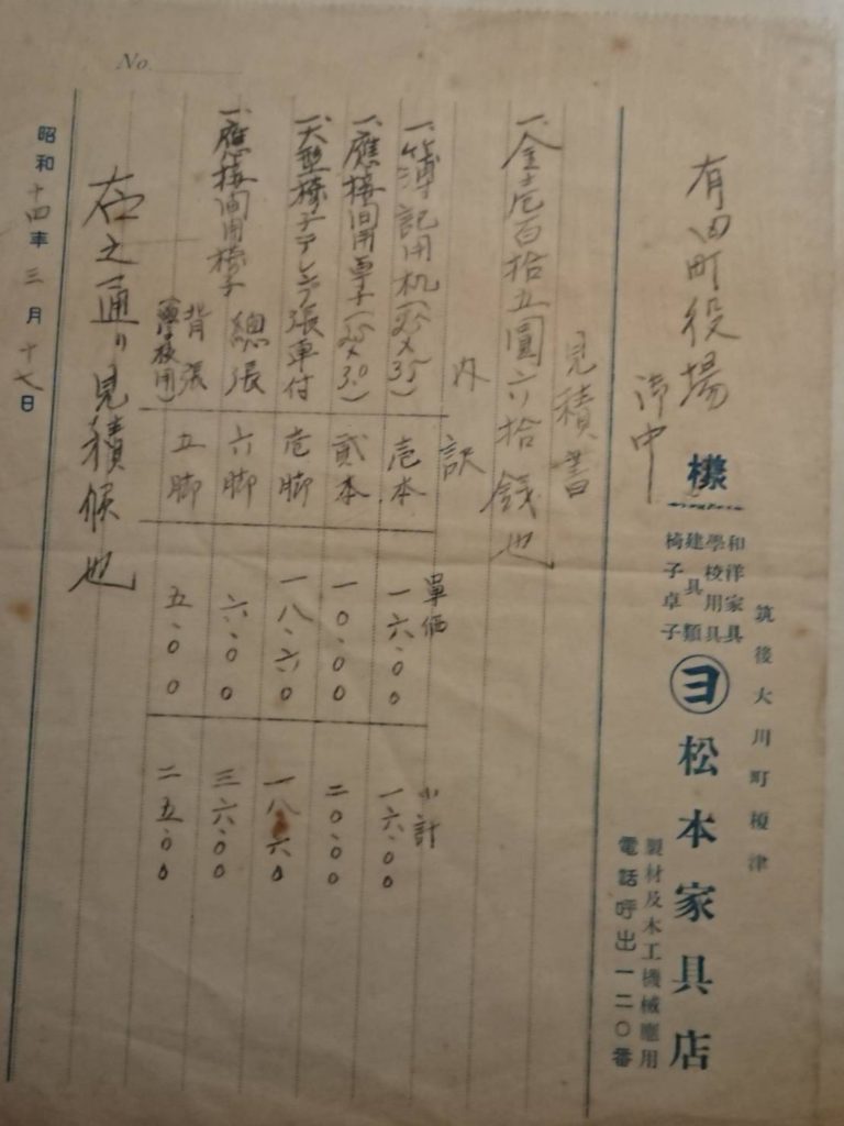 この様な状況の中、大川の木工関係者は後継者育成の為に、三潴郡大川町向町に、木工の後取り教育として大川工業学校を設立させます。 大川の木工の為に終戦後の大川の家具の生産再開を考えての事でした。