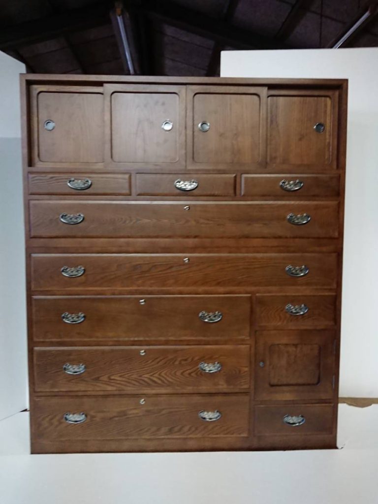 杉と貴重な桐を主材料に使用して、手作りされた榎津箪笥は、間口巾が一間程ある大型の収納箪笥が主で、堂々とした外観に、板の厚みを出来るだけ厚く仕上げる事で堅牢な造りになっていました。
